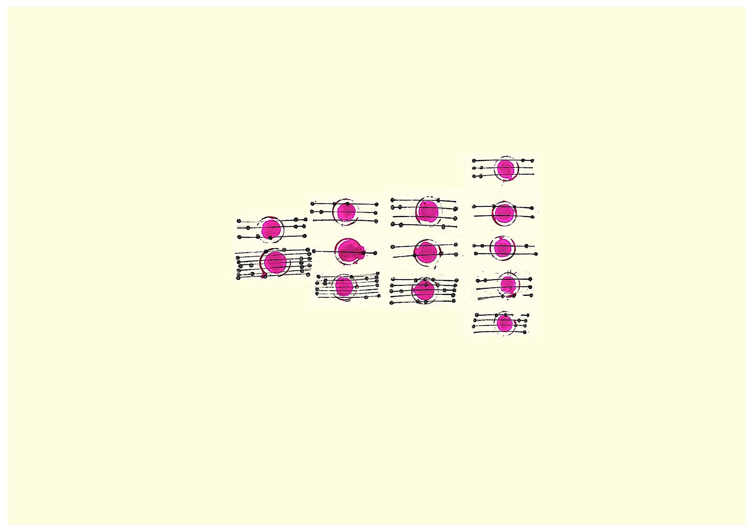 Etsolstera is a language invented in 2019, originally to sit alongside a text called 'Notes from Aarti's Diary. The position of each 'dot' on a 'line' indicates a different letter which remains fixed, whilst words change shape, size and colour. When written, it allows us to manifest the future calling us to think carefully about our intentions, our positions and our power. It is used across different projects, often accompanying symbols or ancestral maps.